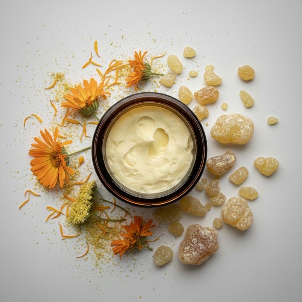 100% Grass- Finished beef tallow^ infused with Calendula flowers*, Yarrow flowers*, Cold-pressed Golden Jojoba oil*, Fair-trade Frankincense Resin*, Cold-pressed Black Cumin Seed Oil*